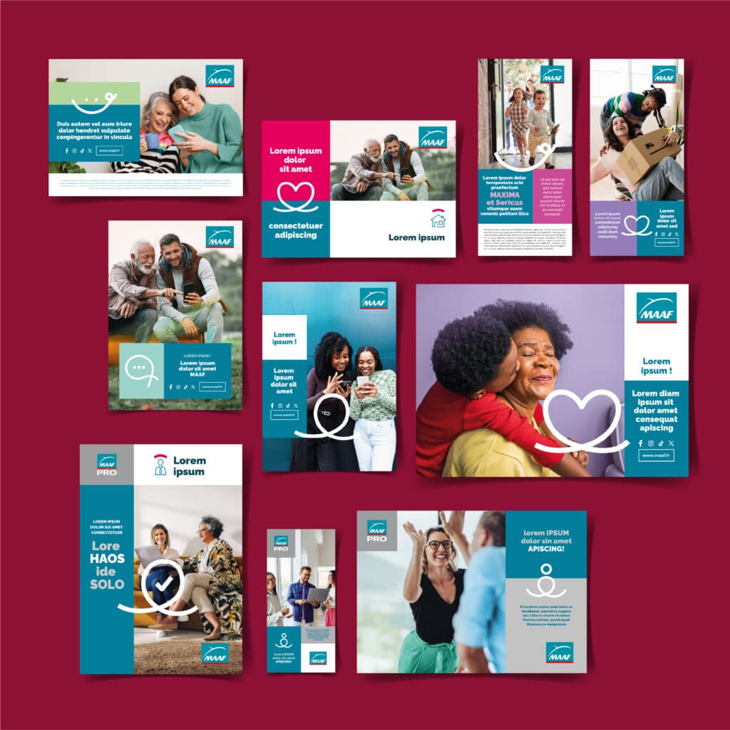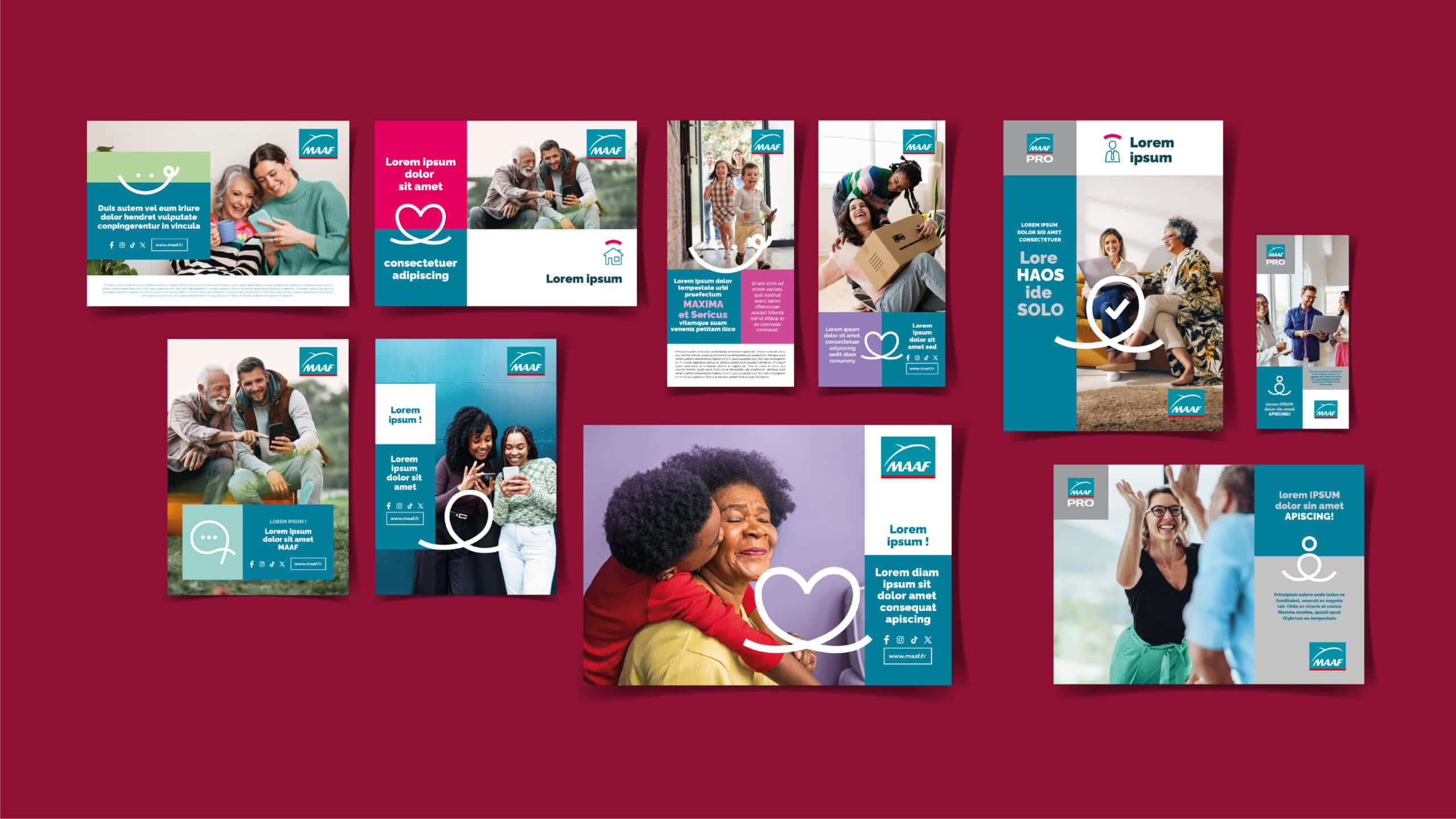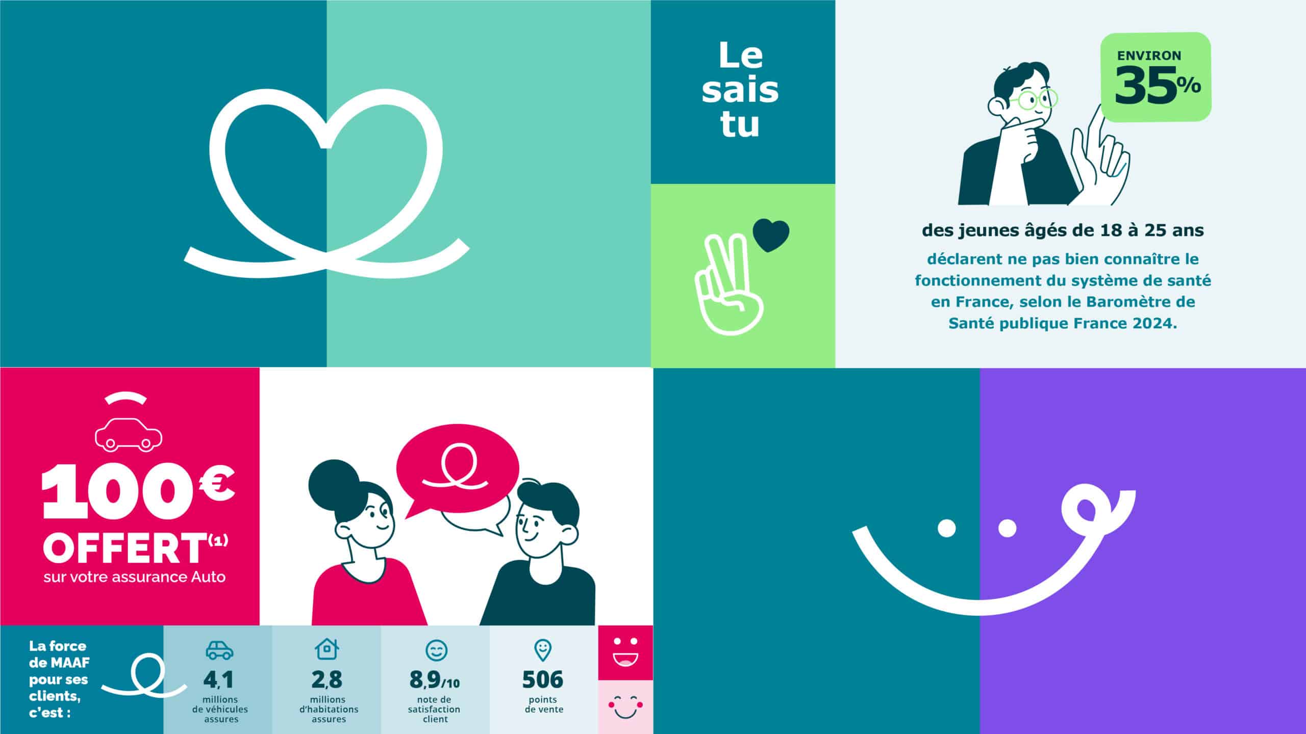 Nous avons conçu une identité simple et modulable, adaptée à tous les formats, avec une iconographie tournée vers les clients, une palette secondaire expressive et des marqueurs pensés pour l’accessibilité. Résultat : un langage visuel plus vivant, plus inclusif et plus flexible, qui apporte modernité, proximité et impact à l’écosystème MAAF.